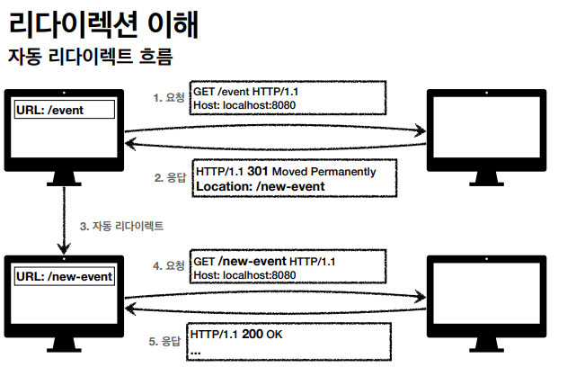 서버에서는 301을 사용해서 Location:/new-event 로 새로운 페이지를 클라이언트에게 알려준다.