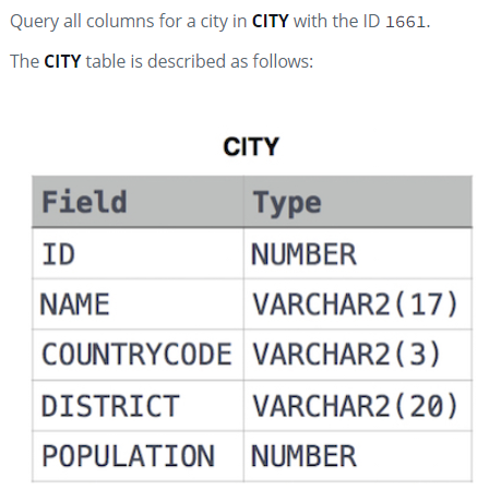 CITY 테이블에서 ID 가 1661 인 값을 구하는 문제이다.