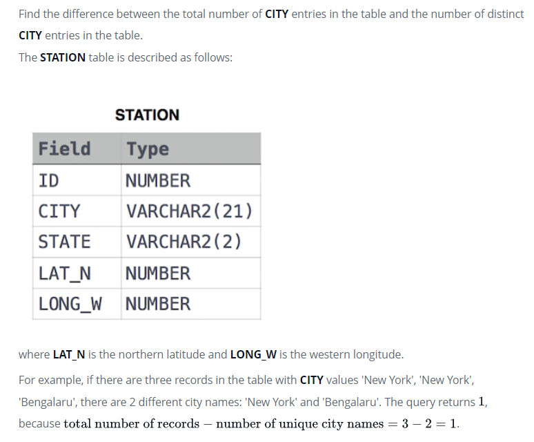 다시한번 적어보기 : select count(city) - count(distinct(city)) from station where id;