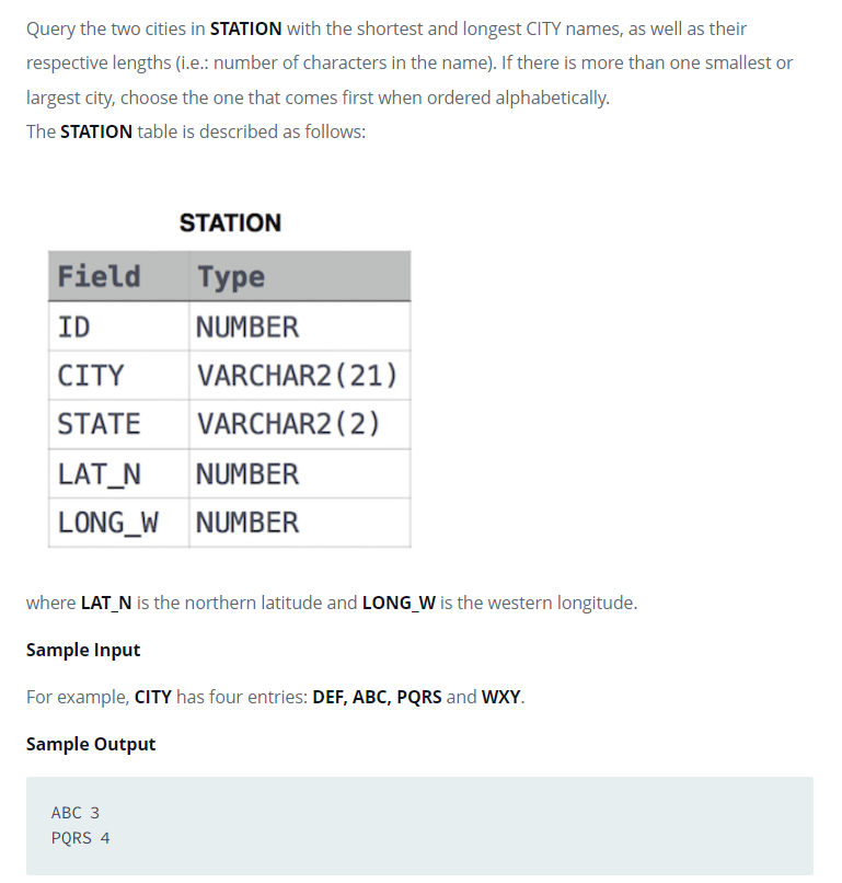 STATION 테이블에서 city 기준으로, city 이름이 가장 짧은 것과 , 가장 긴 것 을 출력하는 문제이다.