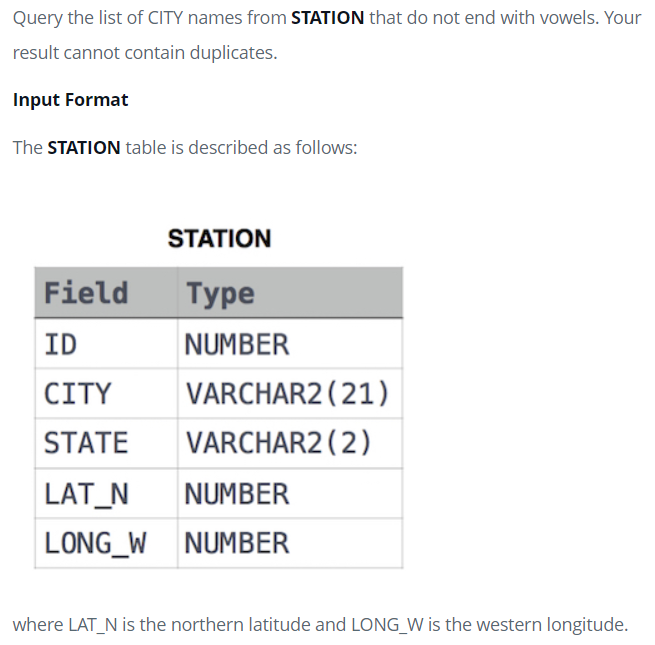 정답 : select distinct city from station where city regexp '[^aeiou]$'