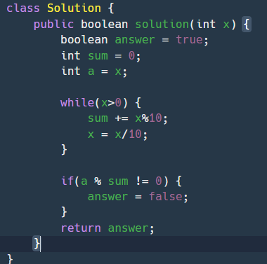 양의 정수 x가 하샤드 수이려면 x의 자릿수의 합으로 x가 나누어져야 합니다. 예를 들어 18의 자릿수 합은 1+8=9이고, 18은 9로 나누어 떨어지므로 18은 하샤드 수입니다. 자연수 x를 입력받아 x가 하샤드 수인지 아닌지 검사하는 함수, solution을 완성해주세요.