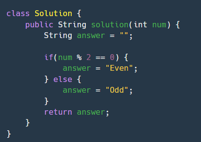 정수 num이 짝수일 경우 "Even"을 반환하고 홀수인 경우 "Odd"를 반환하는 함수, solution을 완성해주세요.