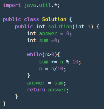 자연수 N이 주어지면, N의 각 자릿수의 합을 구해서 return 하는 solution 함수를 만들어 주세요.