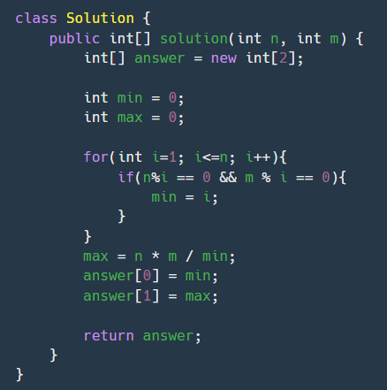 두 수를 입력받아 두 수의 최대공약수와 최소공배수를 반환하는 함수, solution을 완성해 보세요. 배열의 맨 앞에 최대공약수, 그다음 최소공배수를 넣어 반환하면 됩니다. 예를 들어 두 수 3, 12의 최대공약수는 3, 최소공배수는 12이므로 solution(3, 12)는 [3, 12]를 반환해야 합니다.
