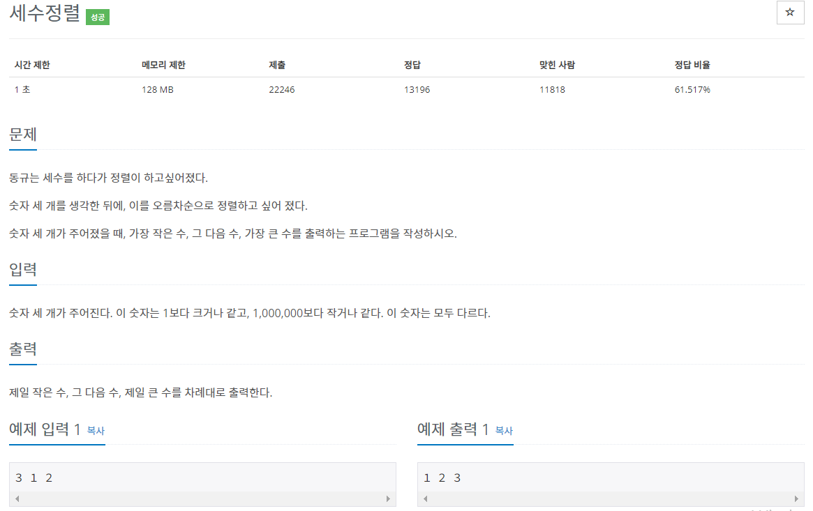 입력받은 3개의 수를 오름차순으로 정렬하는 문제입니다.