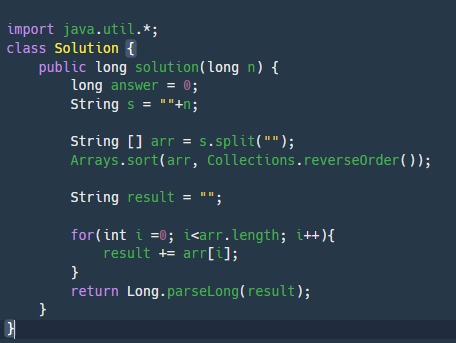 함수 solution은 정수 n을 매개변수로 입력받습니다. n의 각 자릿수를 큰것부터 작은 순으로 정렬한 새로운 정수를 리턴해주세요. 예를들어 n이 118372면 873211을 리턴하면 됩니다.