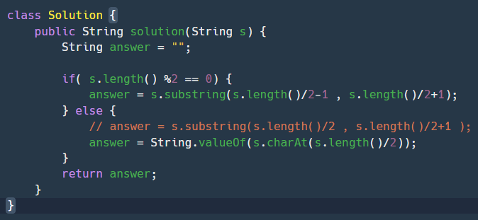 단어 s의 가운데 글자를 반환하는 함수, solution을 만들어 보세요. 단어의 길이가 짝수라면 가운데 두글자를 반환하면 됩니다.
