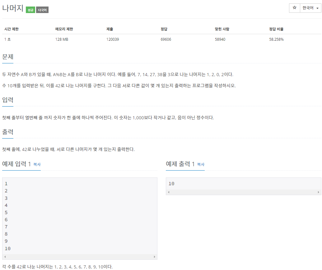 먼저, list에 10개의 숫자를 42로 나눈 나머지를 넣어주고,