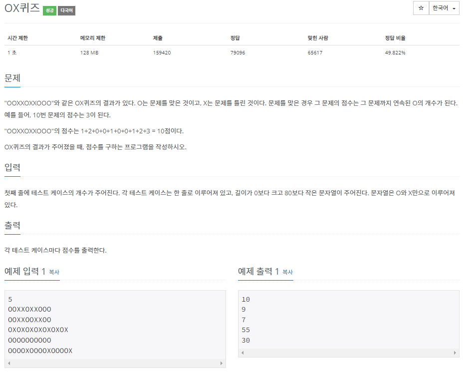 // [i] 가 'O' 이면 score 에 1씩 더해주고 count 도 1씩 더해준다