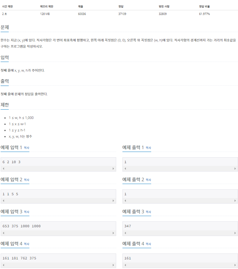 좌표 ( x, y ) 와 좌표 ( w, h ) 가 주어지면 직사각형의 한 변에 최대한 빨리 도달 할 수 있는 거리를 구하는 문제입니다