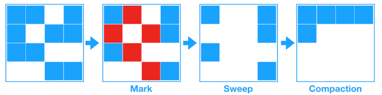 - Sweep : Mark 단계에서 사용되지 않음으로 식별된 메모리를 해제하는 작업