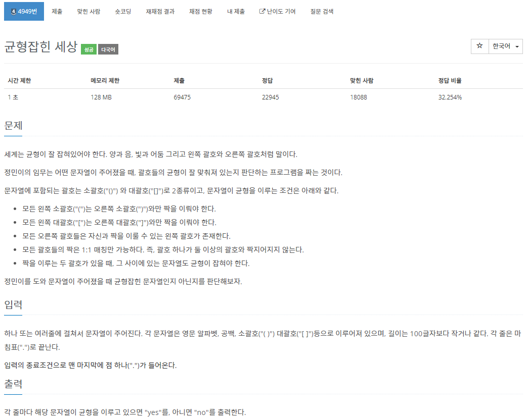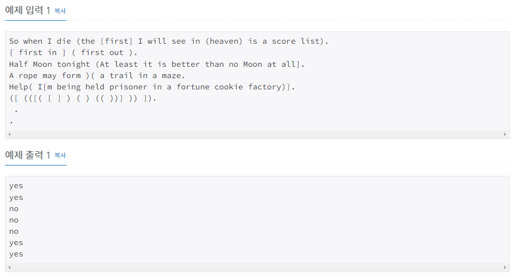 하나 또는 여러줄에 걸쳐서 문자열이 주어진다. 각 문자열은 영문 알파벳, 공백, 소괄호("( )") 대괄호("[ ]")등으로 이루어져 있으며, 길이는 100글자보다 작거나 같다. 각 줄은 마침표(".")로 끝난다