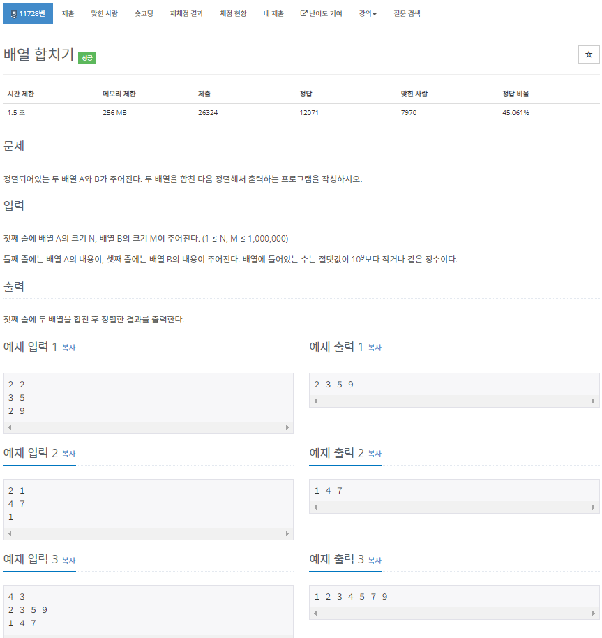 첫째 줄에 배열 A의 크기 N, 배열 B의 크기 M이 주어진다. (1 ≤ N, M ≤ 1,000,000) 둘째 줄에는 배열 A의 내용이, 셋째 줄에는 배열 B의 내용이 주어진다. 배열에 들어있는 수는 절댓값이 109보다 작거