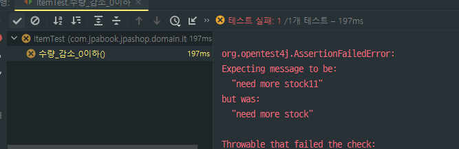 hasMessage 를 내가 정한 메시지가 아니면 아래와 같은 에러가 발생한다.
