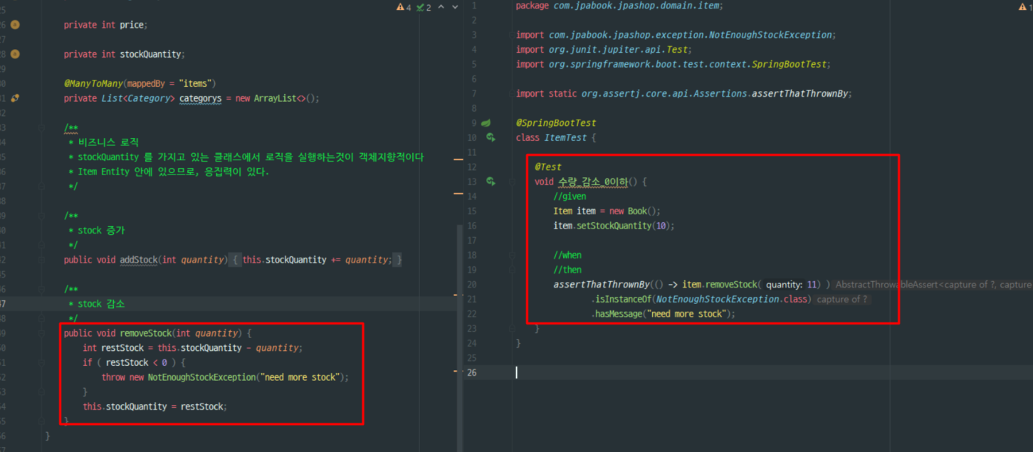 재고가 0 밑으로 떨어지면 NotEnoughStockException 예외를 발생시키면서, "need more stock" 이라는 메세지를 보낸다.