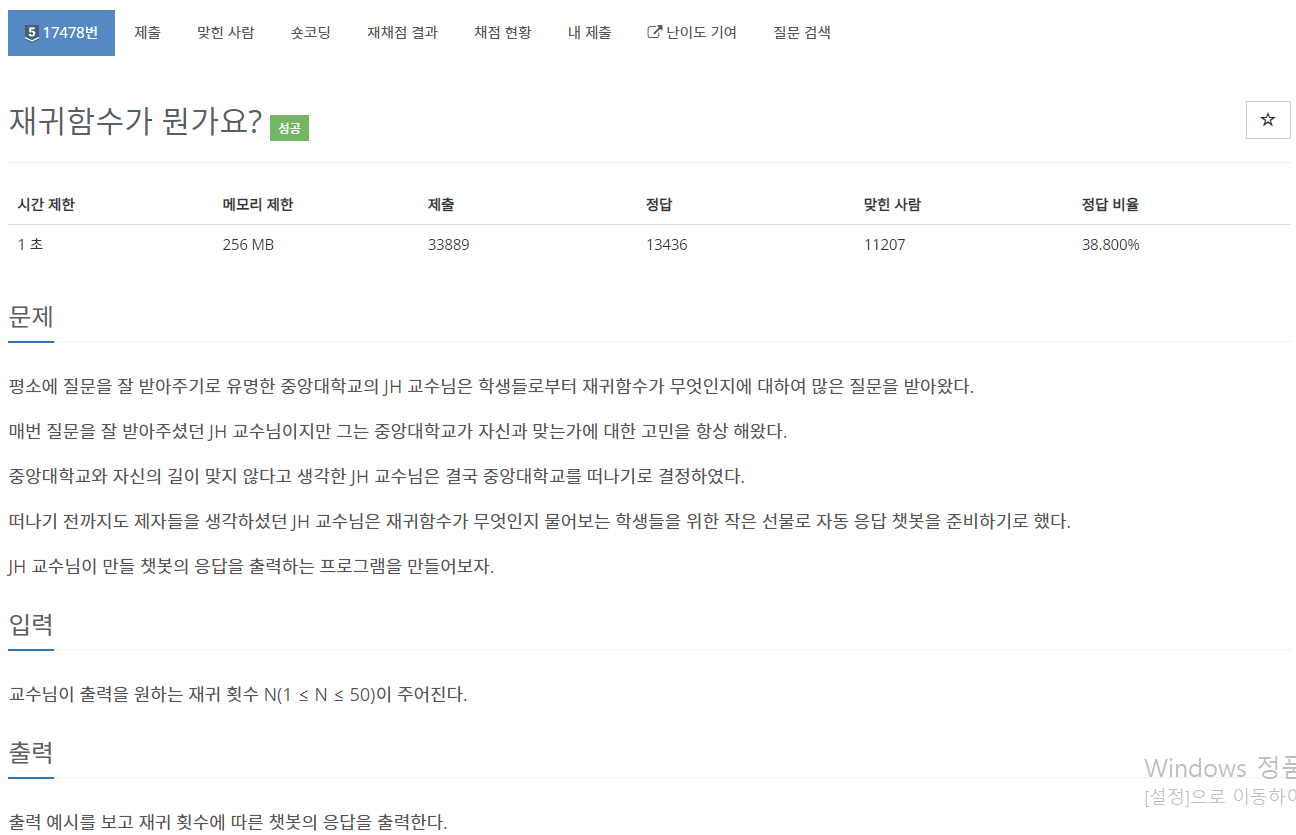 평소에 질문을 잘 받아주기로 유명한 중앙대학교의 JH 교수님은 학생들로부터 재귀함수가 무엇인지에 대하여 많은 질문을 받아왔다. 매번 질문을 잘 받아주셨던 JH 교수님이지만 그는 중앙대