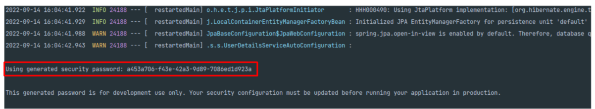 스프링에서 제공하는 아이디는 user 이고, 비밀번호는 애플리케이션을 실행할 때 콘솔창에서 나오는 password 이다.