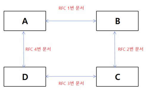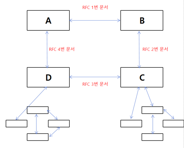 - A 와 B 는 서로의 약속된 규칙의 문서인 RFC 1번 문서를 생성했다. 이것을 프로토콜이라고 부른다