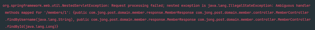 org.springframework.web.util.NestedServletException: Request processing failed; nested exception is java.lang.IllegalStateException: Ambiguous handler methods mapped for '/members/1':