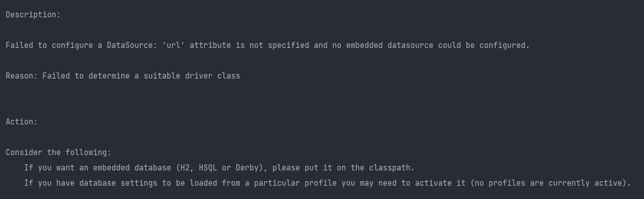 Failed to configure a DataSource: 'url' attribute is not specified and no embedded datasource could be configured.