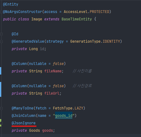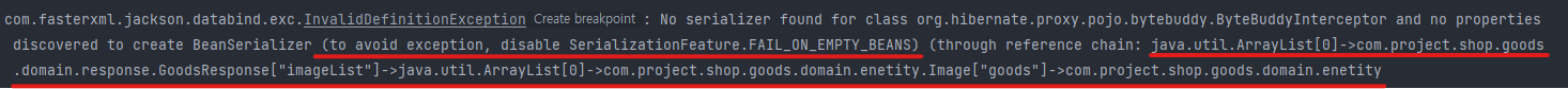 에러 메시지 확인해보니 직렬화과정에서 에러가 발생했으며 참조부분을 따라가보니 Image 엔티티의 goods 객체에서 문제가 발생했다는 것을 알 수 있었다.