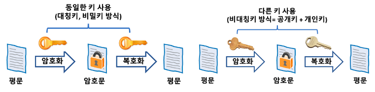| 비대칭키 | 비대칭키보다 느리다. | 상대적으로 안전한 방식이다. 키분배의 필요가 없다. |