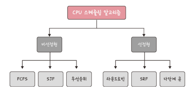 CPU 스케줄링 알고리즘의 종류로는 크게 비선점형과 선점형 방식이 있다.