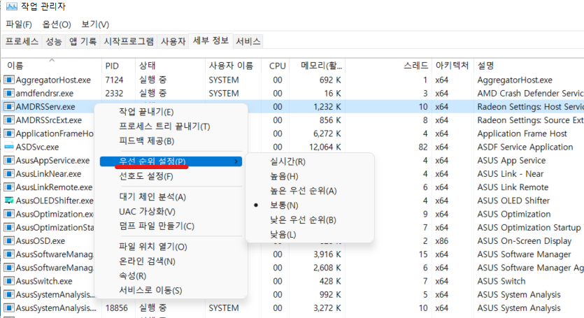 작업관리자에서 우선순위를 직접 설정할 수 있다.
