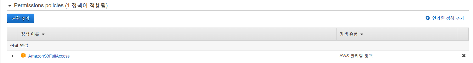 s3 에 연결되어있는 사용자이름을 클릭하고 권한탭에 보면 permissions policies 아래 정책이름을 확인한다.