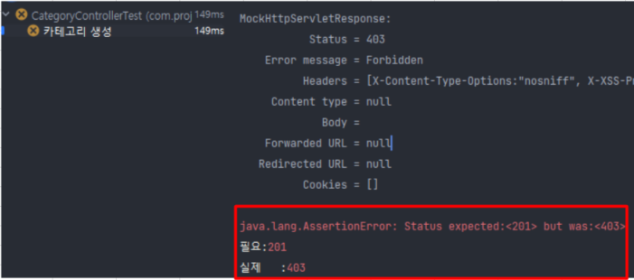 카테고리 생성에 관련된 controller 테스트 중 403 에러가 발생했다.