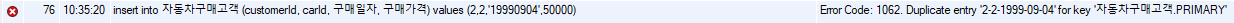 변경 후, 데이터를 하나 추가해보고, 동일한 cusotmerId , carId, date 는 insert 오류가 나는것을 볼 수 있다.