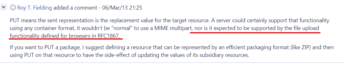 PUT 패키지를 쓰고 싶으면, 패키징 형태로(zip) 표현할 수 있는 리소스를 정의하고, 리소스의 값을 업데이트할 리소스에 PUT을 사용하는 것을 제안한다