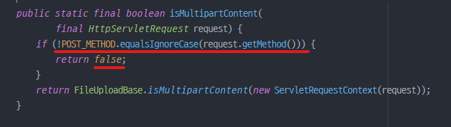 This method explicitly checks for method POST. I believe the PUT method can also have multipart requests, and there may be others. In our case we are receiving rest calls using Spring Framework's CommonsMultipartResolver which in turn uses this method of t