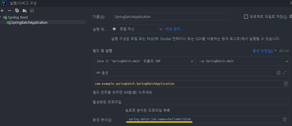 spring.batch.job.names 은 구성 편집에서 추가해줄 예정이다. 파라미터로 받는다.