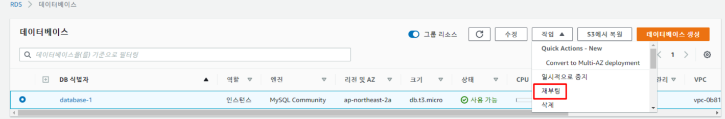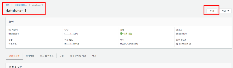 변경이 완료되었으면 이제 사용하고 있는 RDS 에 들어가 수정을 눌러준다.
