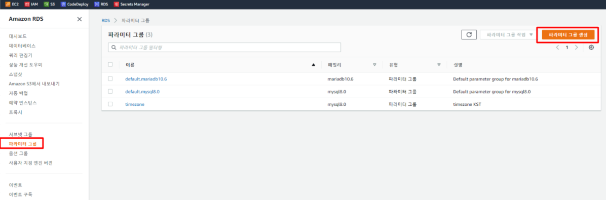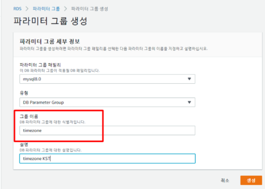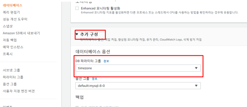 추가 구성 부분에서 DB 파라미터 그룹을 아까 만들었던 timezone 으로 변경해준다.