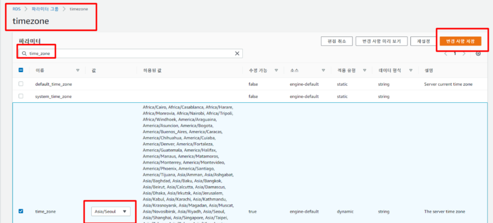 파라미터가 워낙많으니 time_zone 으로 검색하여 Asia/Seoul 로 변경한 후 변경 사항 저장을 한다.