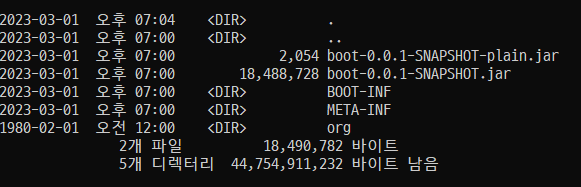 boot-0.0.1-SNAPSHOT.jar 파일의 크기를 보면 약 18M 인 것을 확인할 수 있습니다.