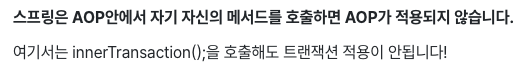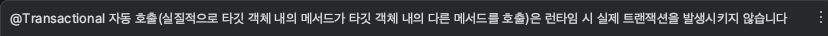 - 외부에서 @Transactional 이 적용되지 않다면 내부 이너메서드에 적용이 되어있더라도 적용되지 않는다.