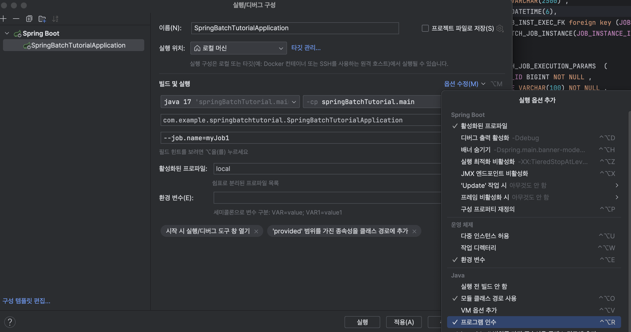 - 프로그램 인수 추가해서 --job.name=myJob1 로 설정