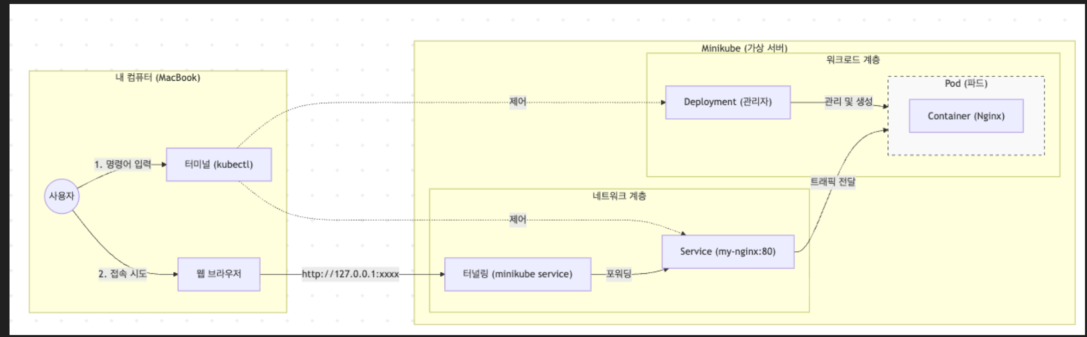 - `minikube service [서비스이름]` NodePort로 노출된 서비스를 내 컴퓨터 브라우저에서 열 수 있도록 주소 연결. (예: `minikube service my-nginx`)